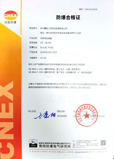 徐州鑫友工控科技發(fā)展有限公司消防電動裝置獲防爆合格證