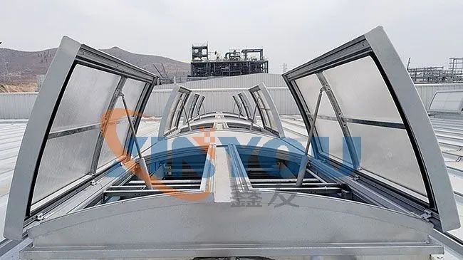 圓拱型電動采光排煙天窗是工業(yè)建筑屋頂常用的一種通風(fēng)采光設(shè)施,主要材料通常采光不同規(guī)格的鋁型材,采光材料一般使用PC陽光板或FRP采光板,圓拱形的設(shè)計,外觀美觀大氣,能更好的防水,同時有效減少風(fēng)壓阻力,可連接消防聯(lián)動控制系統(tǒng)及風(fēng)、雨、煙感應(yīng)器。天窗完全開啟時,排煙量***,***開啟角度為90°。