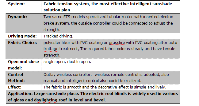 FTS天棚簾特別適用于普通電動卷簾無法安裝的彎曲、傾斜的場合,整個系統(tǒng)由驅(qū)動系統(tǒng)、面料和控制系統(tǒng)三部分組成,驅(qū)動系統(tǒng)采用2個FTS專用管狀電機(jī),分別安裝在兩條卷管中,面料一端固定在其中一條卷管上,固定面料另一端的鋼絲繩卷曲在另一條卷管的卷繩器上。這兩臺電機(jī)通過一個專用的控制器協(xié)調(diào)工作,其中一臺電機(jī)提供面料運(yùn)行的動力,另一臺電機(jī)的剎車同時工作,提供一定的阻力拖住面料,避免面料下墜,天棚完全打開后,面料會卷在其中一條卷管上,運(yùn)行中或停止時面料均有張力,可制作大面積的平面或弧形面的天棚簾系統(tǒng)。